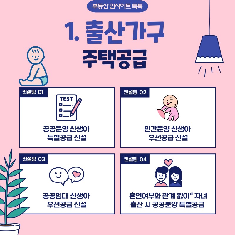출산한 가정에는 정부에서 공급하는 아파트(공공분양)와 민간에서 공급하는 아파트에 대해 가점을 줘 우선분양을 받을 수 있게 하고 임대주택도 우선하여 선택 할 수 있게 한다고 합니다.