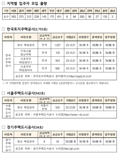 지역별 공고 물량 및 접수 일정은 아래 표와 같습니다.